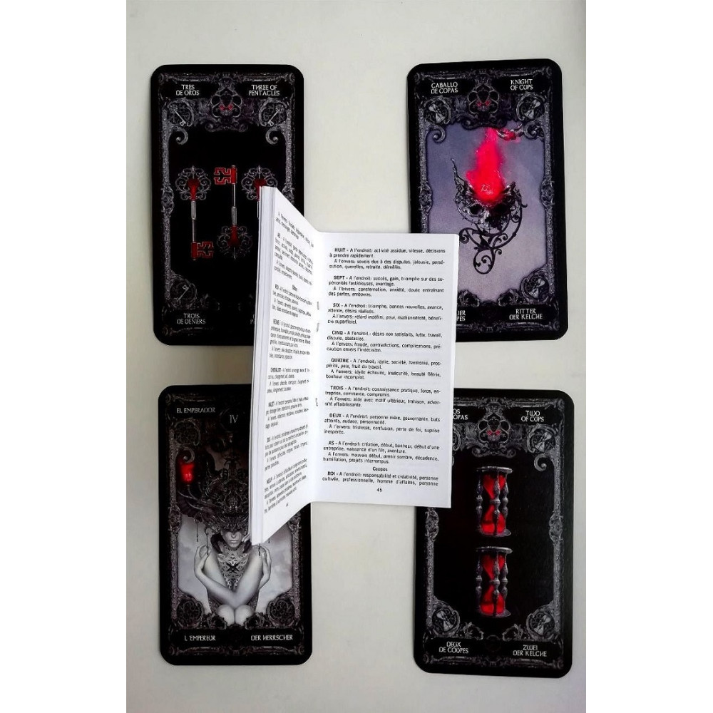 Готичні карти Таро від Фурньє - це вишукана колода в темному, заворожуючому і потойбічному стилі. Карти проілюстровані відомим іспанським художником Necro в його знаменитій містичній манері: чорно-білі, бляклі тони зі сплесками криваво-червоного кольору. Кожна карта цієї колоди - це деталізований витвір мистецтва, співзвучний із найвищими струнами душі.