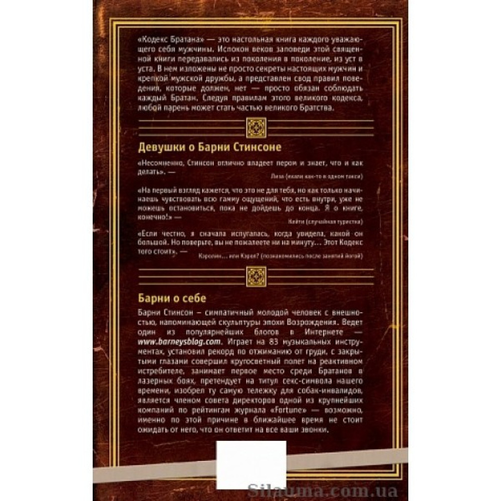 "Кодекс Братана» - это настольная книга каждого уважающего себя мужчины. Испокон веков заповеди этой священной книги передавались из поколения в поколение из уст в уста. В нем изложены не просто секреты настоящих мужчин и крепкой мужской дружбы, а представлен свод правил поведения, которые должен, нет – просто обязан, соблюдать каждый Братан. Следуя правилам этого великого кодекса, любой парень может стать частью великого Братства.