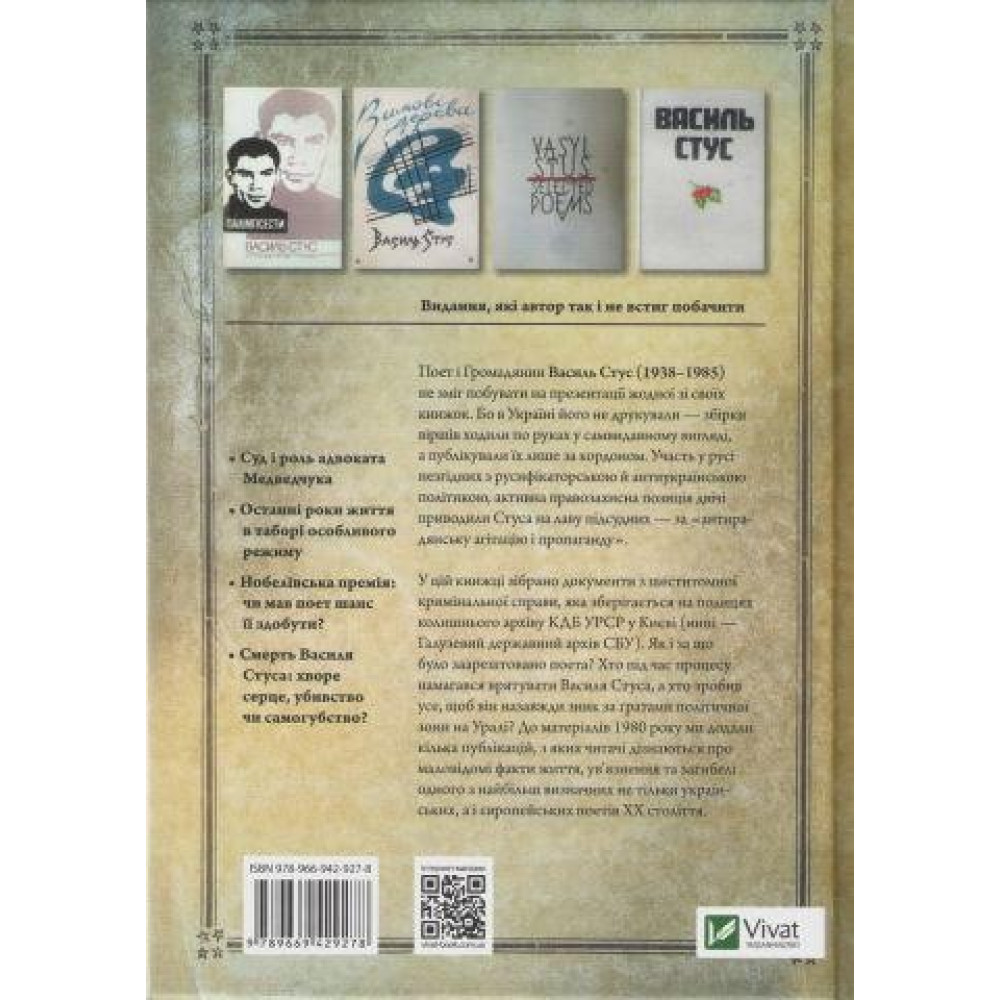 Правда про кримінальну справу, життя і смерть Василя Стуса. У книжці зібрано архівні документи з кримінальної справи Василя Стуса, покази свідків, листи поета з тюрми, спогади його рідних та друзів. Ознайомившись із наведеними матеріалами, читачі дізнаються про невідомі факти щодо життя, ув’язнення та загибелі Стуса, які досі охороняли під грифом «Секретно».