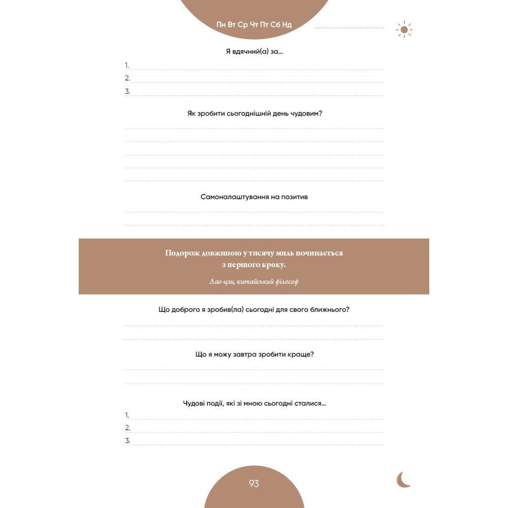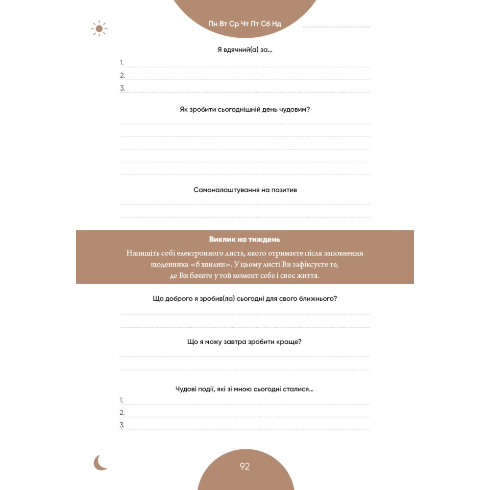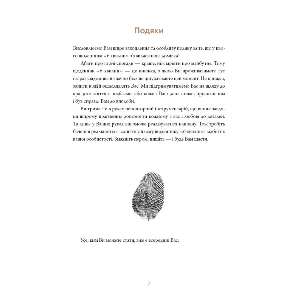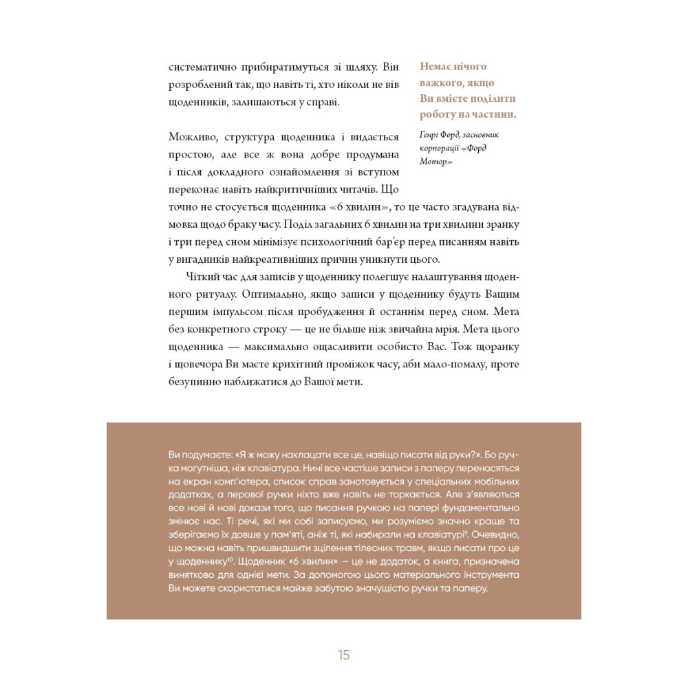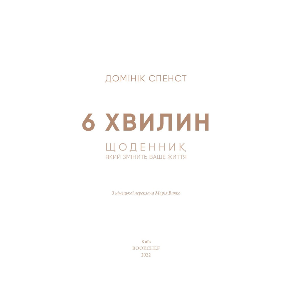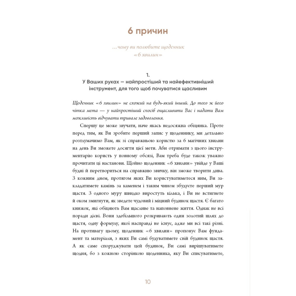 Кожен із нас хоче стати щасливим, упевненим у собі й успішним. Ми читаємо розумні книги з порадами, як цього досягти. Щороку / щомісяця / щопонеділка починаємо докладати певних зусиль, прямуючи до поставленої мети. Однак постійно щось іде не так, і ми опускаємо руки, бо у нас немає часу / сил / змоги впроваджувати такі необхідні зміни у своє життя. Усе це врахував німецький економіст Домінік Спенст. Він створив унікальний щоденник «6 хвилин», який допоможе вам не відкладати зміни на потім. Витрачаючи лише 3 хвилини вранці й 3 хвилини увечері, ви зможете сформувати корисні звички, які допоможуть зробити ваше життя більш усвідомленим, гармонійним і щасливим. Перевірені на практиці методи не дозволять вам припинити роботу над собою, а відтак ви зможете завершити розпочату трансформацію.