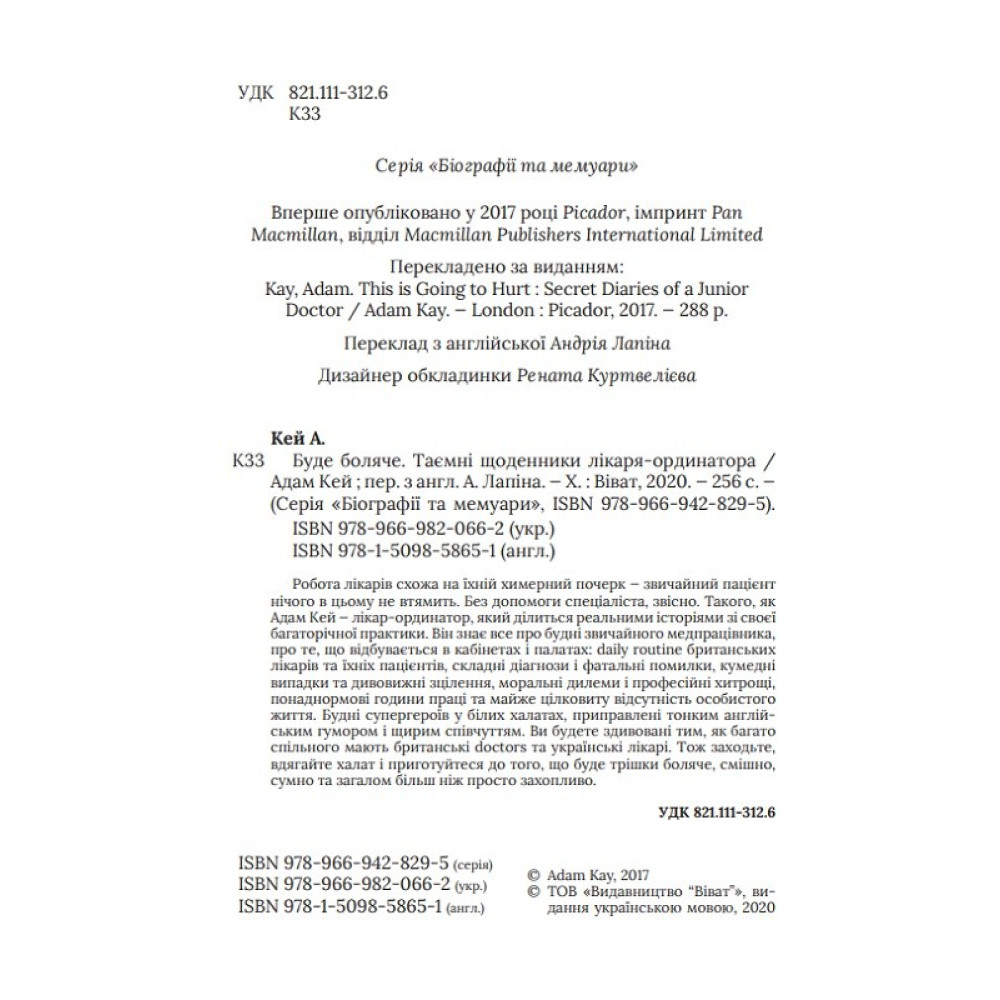Робота лікарів схожа на їхній химерний почерк — звичайний пацієнт нічого в цьому не втямить. Без допомоги спеціаліста, звісно. Такого, як Адам Кей — лікар-ординатор, який ділиться реальними історіями зі своєї багаторічної практики. Він знає все про будні звичайного медпрацівника, про те, що відбувається в кабінетах і палатах: daily routine британських лікарів та їхніх пацієнтів, складні діагнози і фатальні помилки, кумедні випадки та дивовижні зцілення, моральні дилеми і професійні хитрощі, понаднормові години праці та майже цілковиту відсутність особистого життя. Будні супергероїв у білих халатах, приправлені тонким англійським гумором та щирим співпереживанням. Ви будете здивовані тим, як багато спільного мають британські doctors та українські лікарі. Тож заходьте, вдягайте халат і приготуйтеся до того, що буде трішки боляче, смішно, сумно та загалом більш ніж просто захопливо.