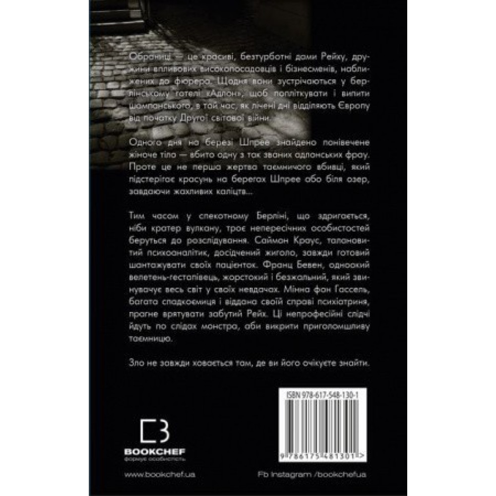 Обраниці — це красиві, безтурботні дами Рейху, дружини впливових високопосадовців і бізнесменів, наближених до фюрера. Щодня вони зустрічаються у берлінському готелі «Адлон», щоб попліткувати і випити шампанського, в той час, як лічені дні відділяють Європу від початку Другої світової війни. Одного дня на березі Шпрее знайдено понівечене жіноче тіло — вбито одну з так званих адлонських фрау. Проте це не перша жертва таємничого вбивці, який підстерігає красунь на берегах Шпрее або біля озер, завдаючи жахливих каліцтв... Тим часом у спекотному Берліні, що здригається, ніби кратер вулкану, троє непересічних особистостей беруться до розслідування. Саймон Краус, талановитий психоаналітик, досідчений жиголо, завжди готовий шантажувати своїх пацієнток. Франц Бевен, одноокий велетень-гестапівець, жорстокий і безжальний, який звинувачує весь світ у своїх невдачах. Мінна фон Гассель, багата спадкоємиця і віддана своїй справі психіатриня, прагне врятувати забутий Рейх. Ці непрофесійні слідчі йдуть по слідах монстра, аби викрити приголомшливу таємницю. Зло не завжди ховається там, де ви його очікуєте знайти.