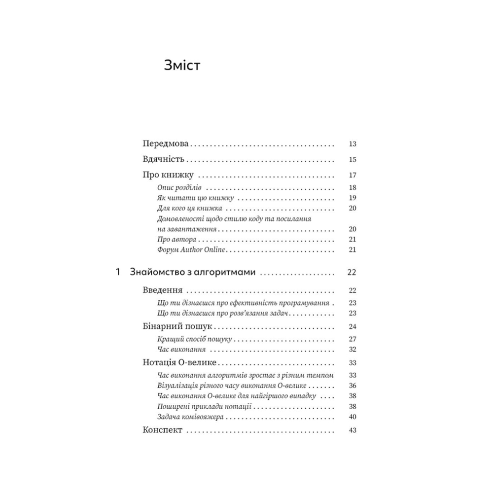 Я наводжу багато прикладів. Моя ціль — спростити візуалізацію концептів, а не заплутати нагромадженням незрозумілих символів. Так, я візуал, і ця книжка просто переповнена малюнками. Зміст ретельно продумано. Усі алгоритми цієї книжки — практичні. Я вважаю їх корисними в моїй професії програмного інженера, і вони забезпечують хорошу основу для інших, складніших тем.