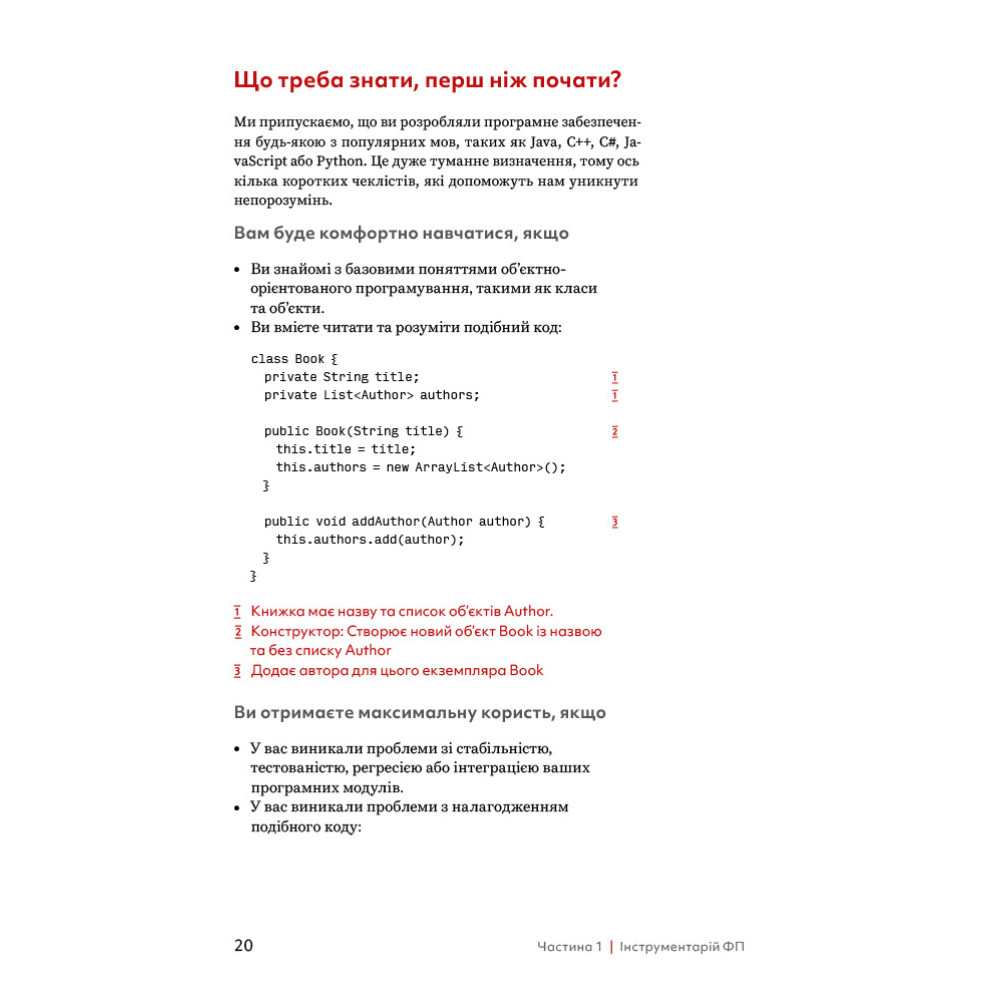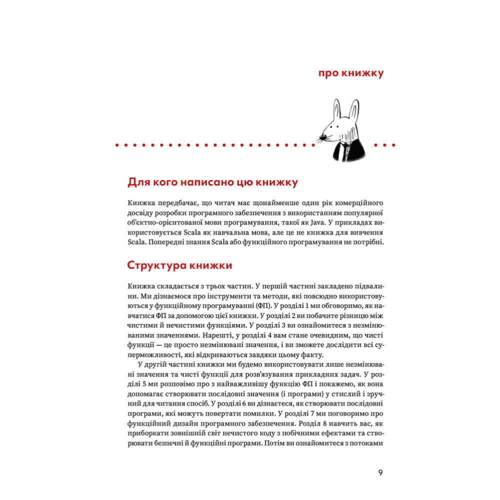 Книжка передбачає, що читач має щонайменше один рік комерційного досвіду розробки програмного забезпечення з використанням популярної об’єктно-орієнтованої мови програмування, такої як Java. У прикладах використовується Scala як навчальна мова, але це не книжка для вивчення Scala. Попередні знання Scala або функційного програмування не потрібні.
