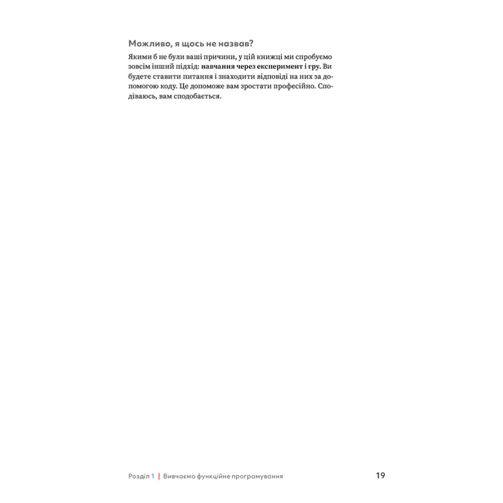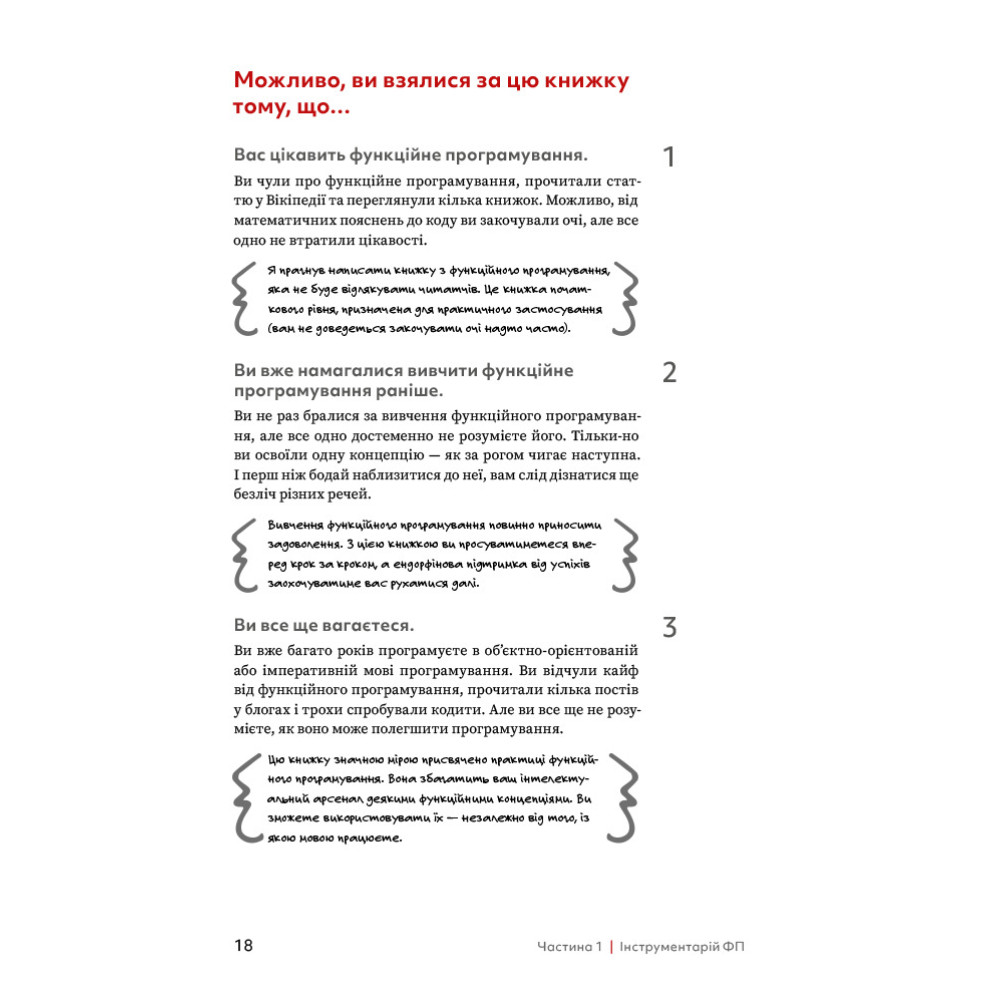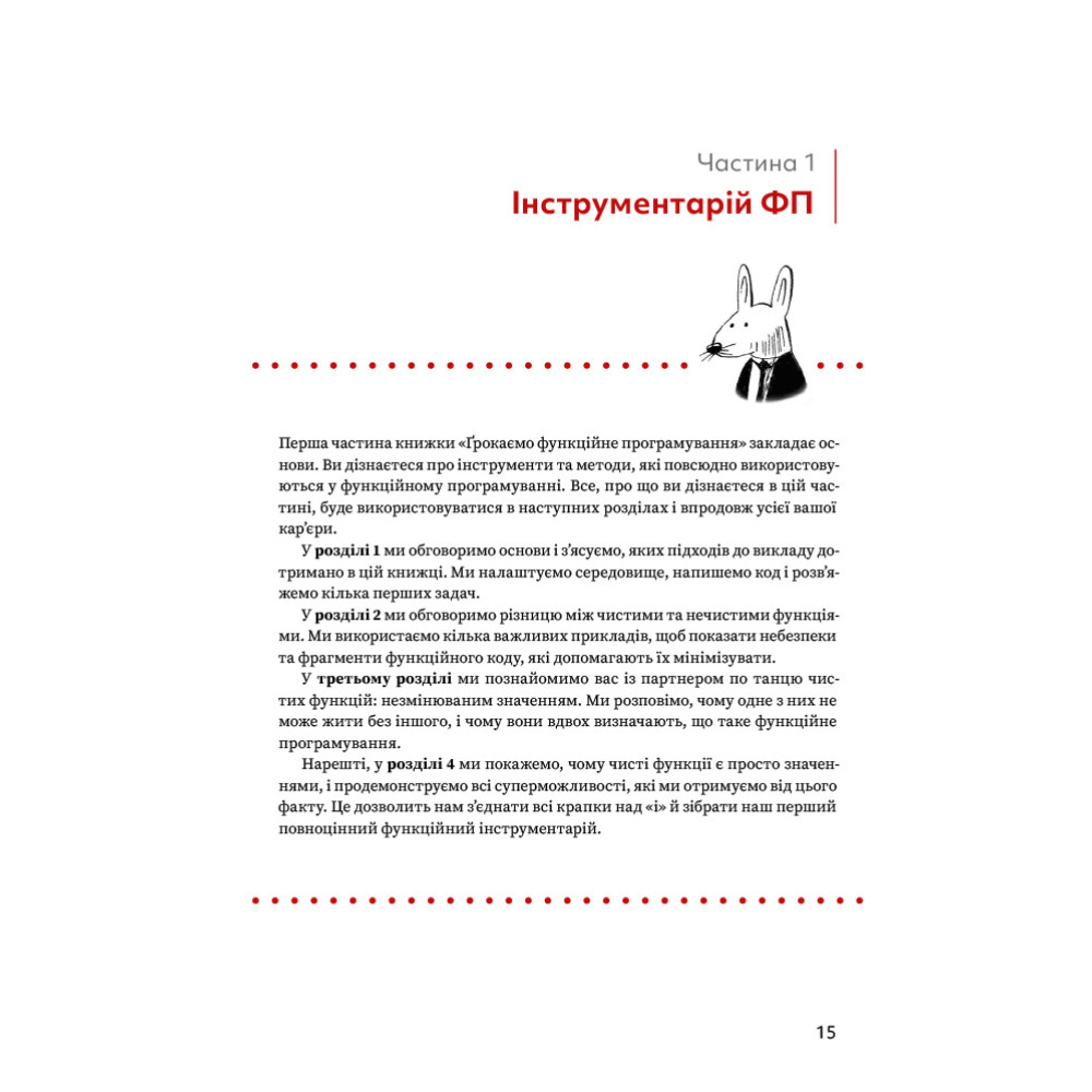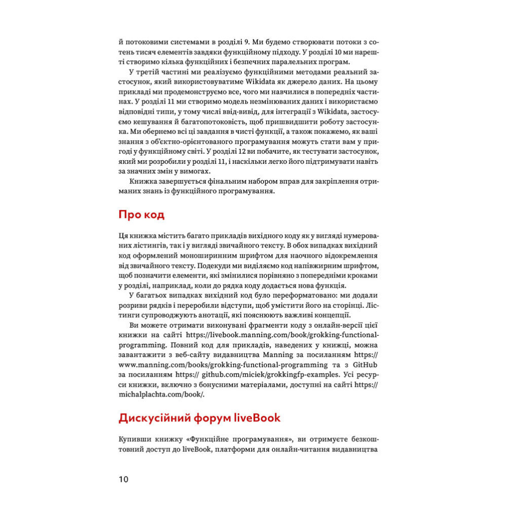 Книжка складається з трьох частин. У першій частині закладено підвалини. Ми дізнаємося про інструменти та методи, які повсюдно використовуються у функційному програмуванні (ФП). У другій частині книжки ми будемо використовувати лише незмінювані значення та чисті функції для розв’язування прикладних задач. У третій частині ми реалізуємо функційними методами реальний застосунок, який використовуватиме Wikidata як джерело даних. На цьому прикладі ми продемонструємо все, чого ми навчилися в попередніх частинах. Книжка завершується фінальним набором вправ для закріплення отриманих знань із функційного програмування.