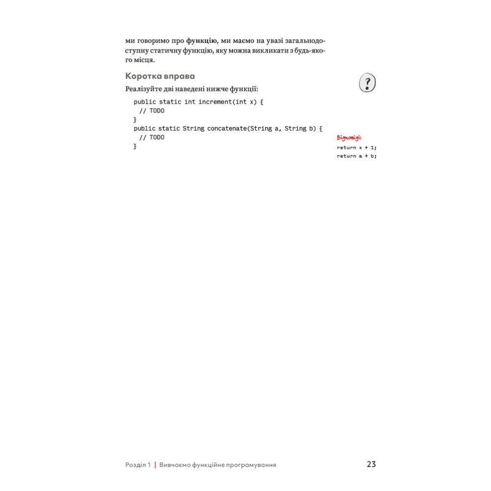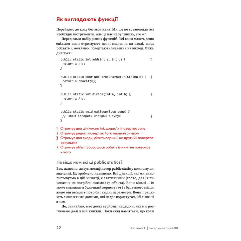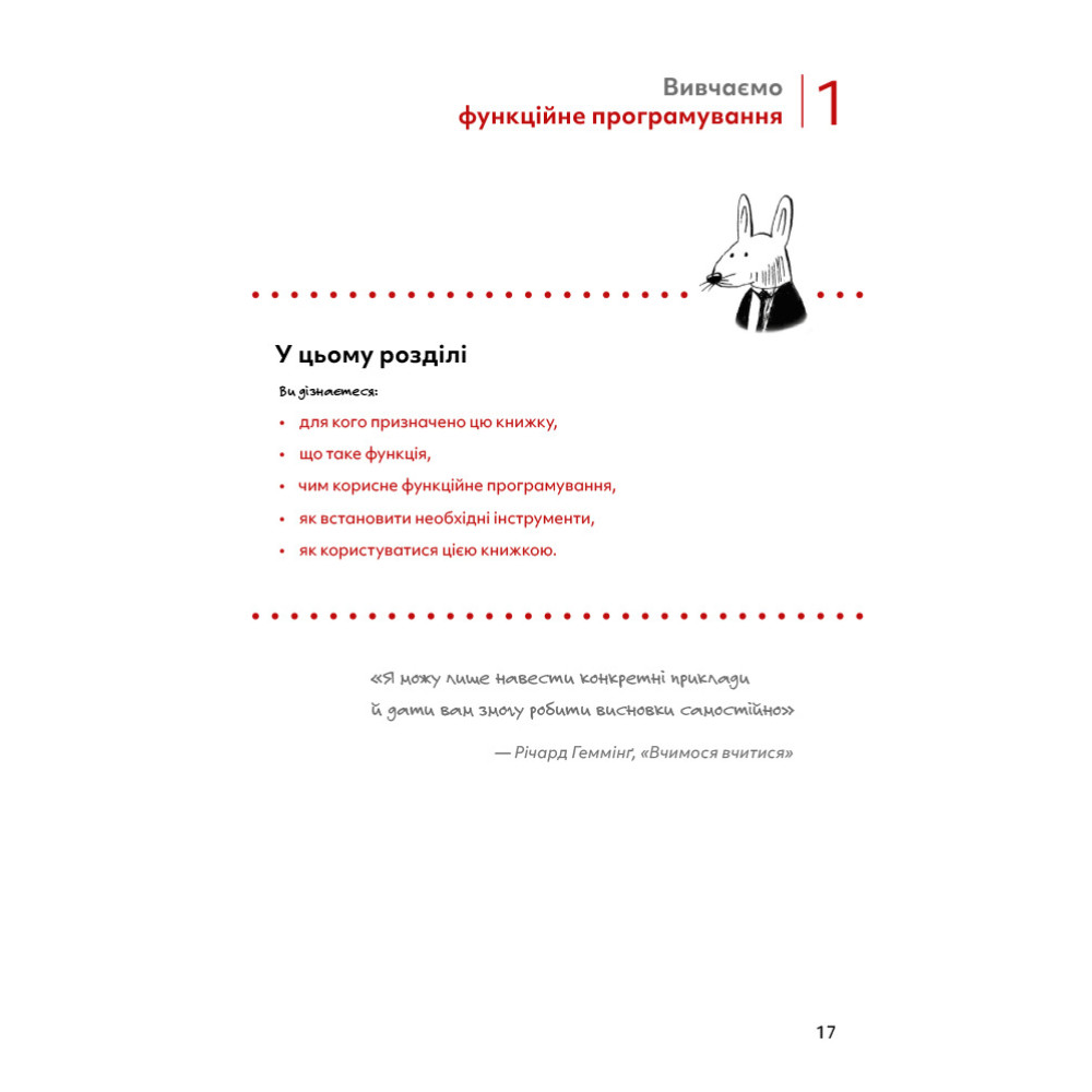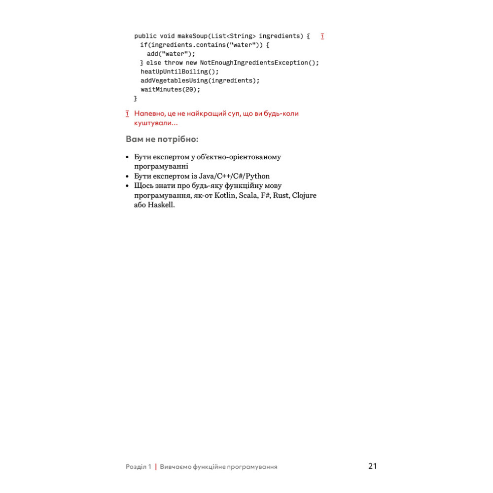 Книжка складається з трьох частин. У першій частині закладено підвалини. Ми дізнаємося про інструменти та методи, які повсюдно використовуються у функційному програмуванні (ФП). У другій частині книжки ми будемо використовувати лише незмінювані значення та чисті функції для розв’язування прикладних задач. У третій частині ми реалізуємо функційними методами реальний застосунок, який використовуватиме Wikidata як джерело даних. На цьому прикладі ми продемонструємо все, чого ми навчилися в попередніх частинах. Книжка завершується фінальним набором вправ для закріплення отриманих знань із функційного програмування.