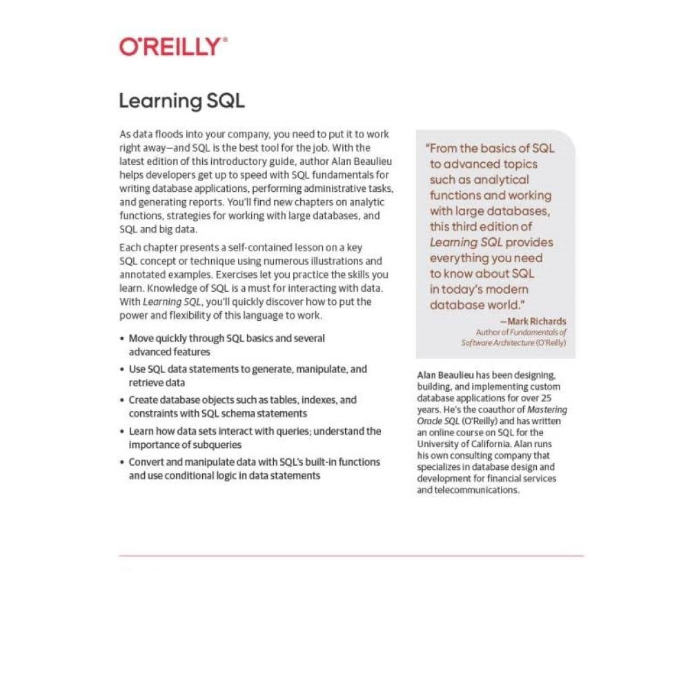 Each chapter presents a self-contained lesson on a key SQL concept or technique using numerous illustrations and annotated examples. Exercises let you practice the skills you learn. Knowledge of SQL is a must for interacting with data. With Learning SQL, you’ll quickly discover how to put the power and flexibility of this language to work.