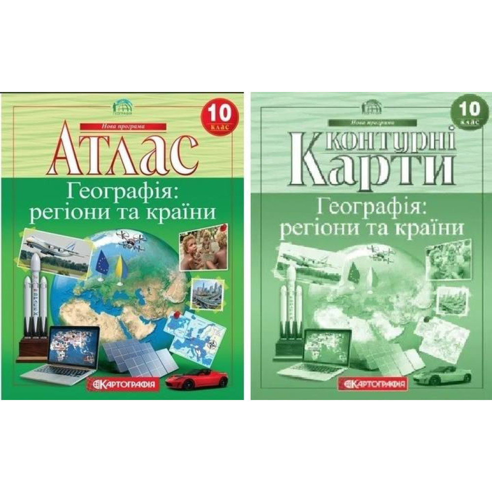 Цей навчальний комплект створено відповідно до програми з географії для 10 класу, яка охоплює тему «Географія: регіони та країни». У комплект входять атлас із сучасними тематичними картами та контурні карти для закріплення знань і формування практичних навичок.
