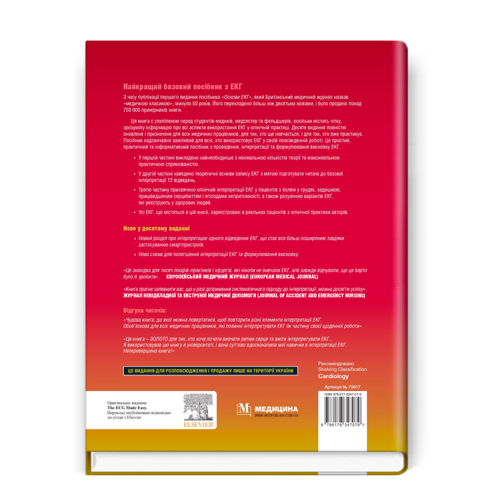 Ця книга є улюбленою серед студентів-медиків, медсестер та фельдшерів, оскільки містить чітку, зрозумілу інформацію про всі аспекти використання ЕКГ у клінічній практиці. Десяте видання повністю оновлене і призначене для всіх медичних працівників, для тих, хто ще навчається, і для тих, хто вже практикує. Посібник надзвичайно важливий для всіх, хто використовує ЕКГ у своїй повсякденній роботі. Це простий, практичний та інформативний посібник з проведення, інтерпретації та формулювання висновку ЕКГ.