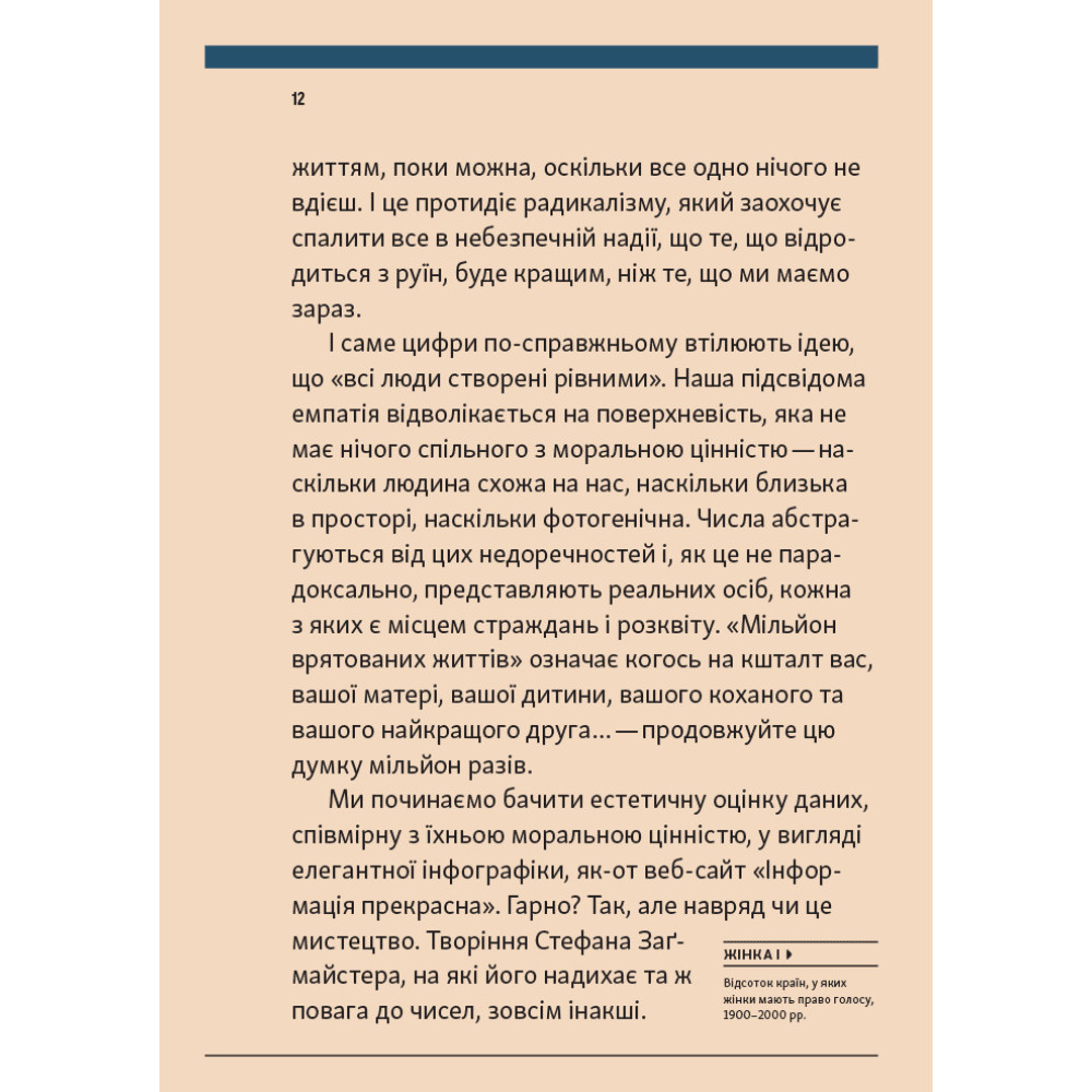 Ця книжка — своєрідний огляд мистецько-просвітницького проєкту Стефана Заґмайстера, у межах якого він презентує реальні дані щодо розвитку нашої цивілізації останніх десятиліть і століть за допомогою деконструкції й переосмислення витворів мистецтва минулого. Ці роботи в супроводі авторських коментарів і роздумів мають цілком благородну мету: створити противагу негативу, який поширюють медіа задля привернення уваги публіки, і наголосити, що попри всі лиха й страждання людство рік за роком неухильно рухається до довшого, здоровішого і щасливішого життя.