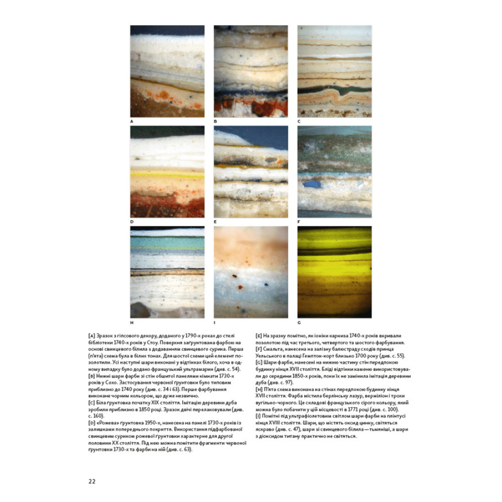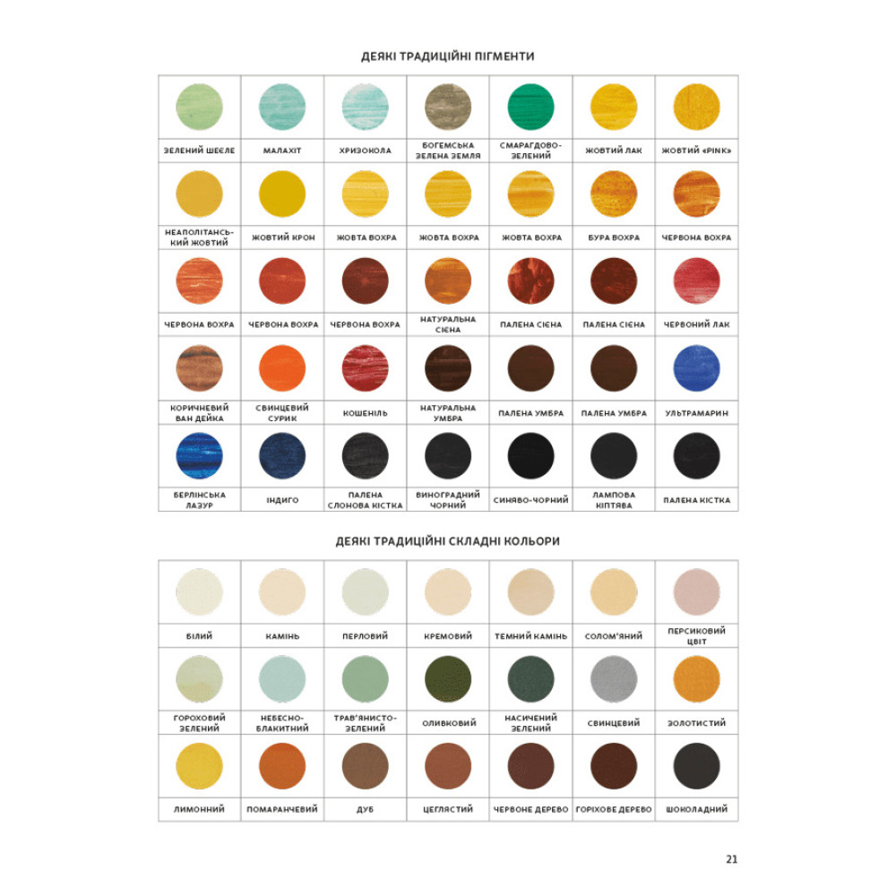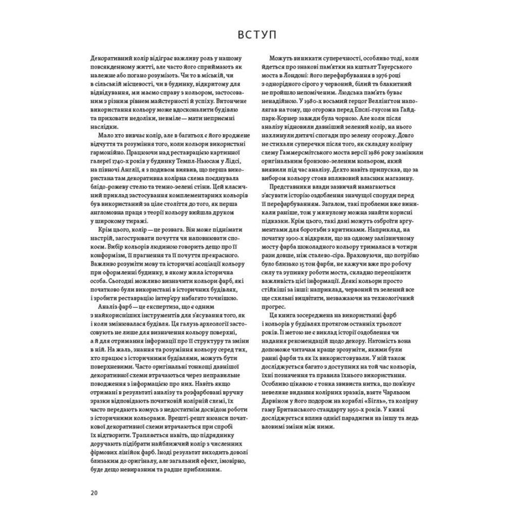 Спираючись на свій величезний спеціалізований архів, історик і фахівець із фарб Патрік Беті простежує еволюцію пігментів і кольорів фарби разом із системами кольорів і стандартами, а також досліджує їхній вплив на кольорові палітри, що використовувалися в інтер’єрах з 1650-х до 1960-х років. Автор починає свій опис зі створення у фарб звичайних і дорогих кольорів, виготовлених із традиційних земляних пігментів між 1650 і 1799 роками. Потім він досліджує появу кольорових систем і стандартів та їхній вплив на кольори фарби разом із впливом промислового виробництва на текстуру та довговічність фарб. Насамкінець, Беті звертає увагу на кольорові стандарти ХХ століття. В авторитетному та виразному тексті вплетені спеціально замовлені фотографії сторінок рідкісних кольорових довідників.