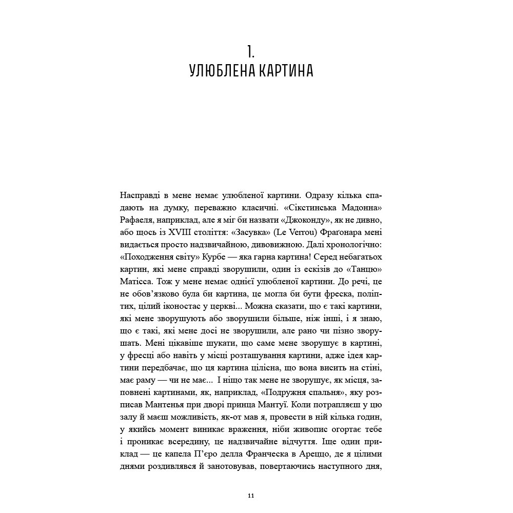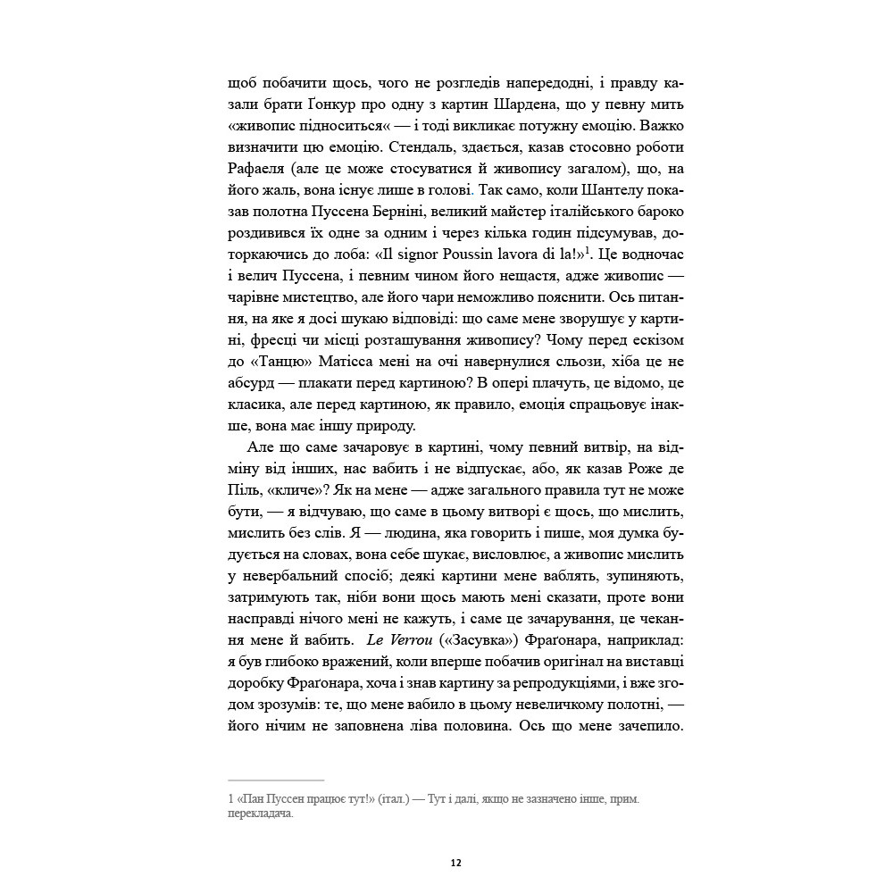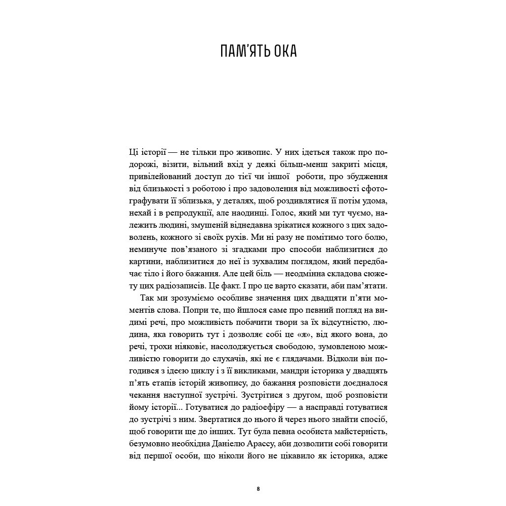 Книжку укладено на основі циклу з двадцяти п’яти передач, трансльованих по радіо France Culture під назвою «Історії картин» влітку 2003 року. Даніель Арасс із притаманним йому ентузіазмом, сміливістю й ерудицією проводить нас через шість століть історії живопису — від винайдення перспективи до зникнення фігури. Звертаючись до основоположних питань (перспектива, сюжет Благовіщення, роль деталі, піднесення й занепад анахронізму, реставрація й умови огляду витворів на виставках) він інтелектуально і пристрасно оживлює ключові постаті й стилі: Леонардо да Вінчі, Мікеланджело, маньєризм, Вермеєр, Інґрес і Мане. Його аналіз постійно підживлюється конкретними прикладами, кульмінацією яких стають дуже специфічні аспекти сучасного мистецтва. Саме так, через тонкі й відкриті прочитання, які він пропонує, Даніель Арасс прищеплює смак до бачення й переосмислення великих моментів живопису — дивуючи, пробуджуючи й залучаючи нас до справжньої магії свого інтелекту, незмінно приправленого гумором.