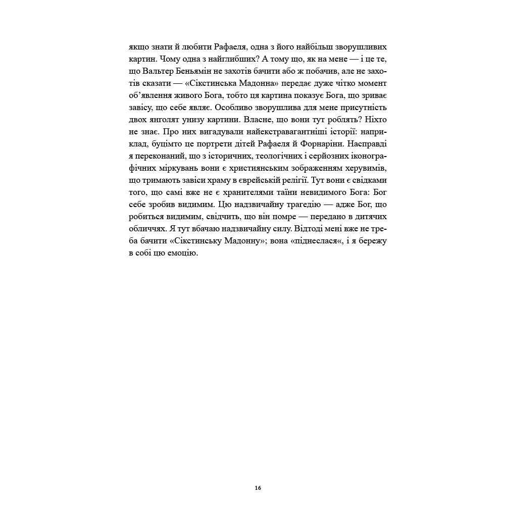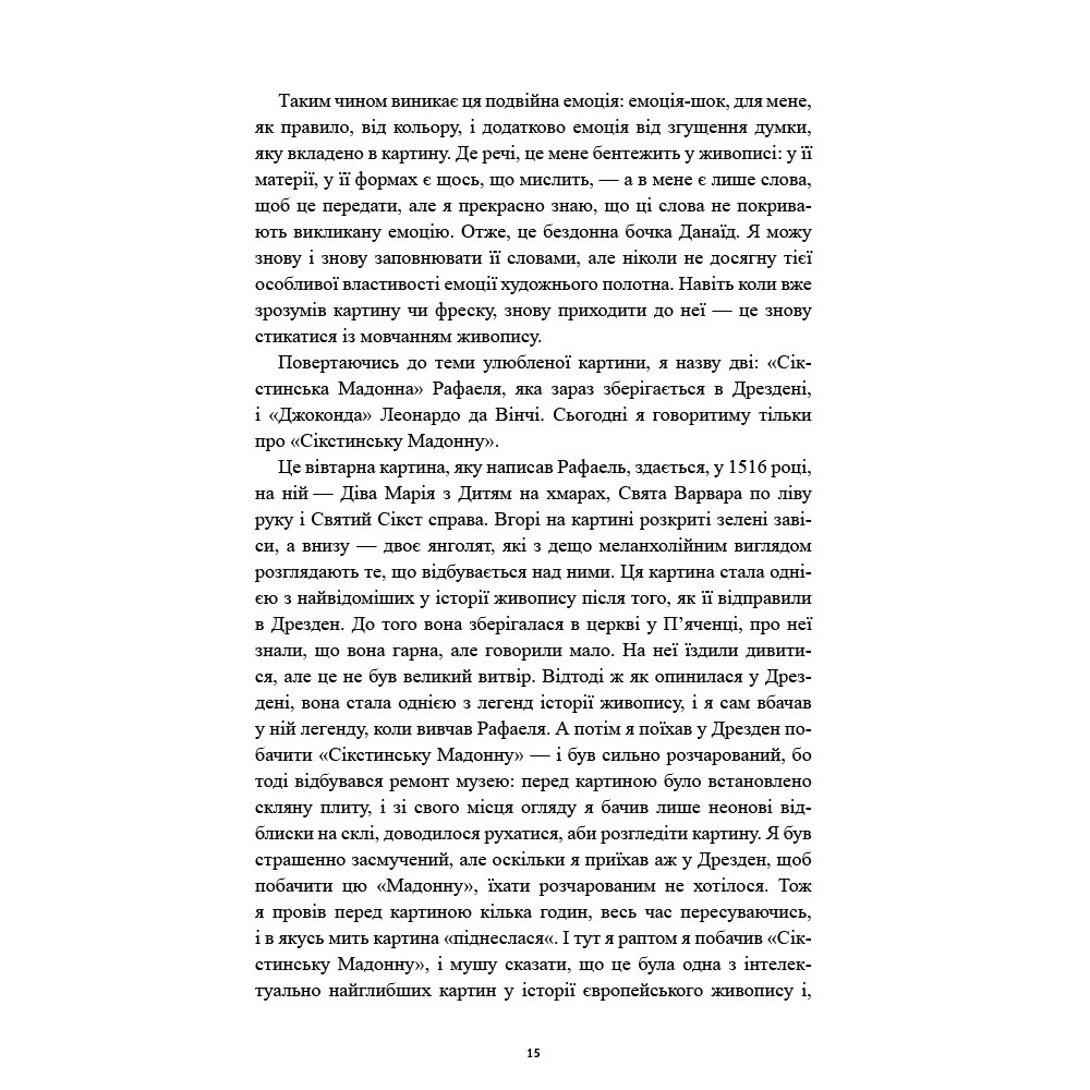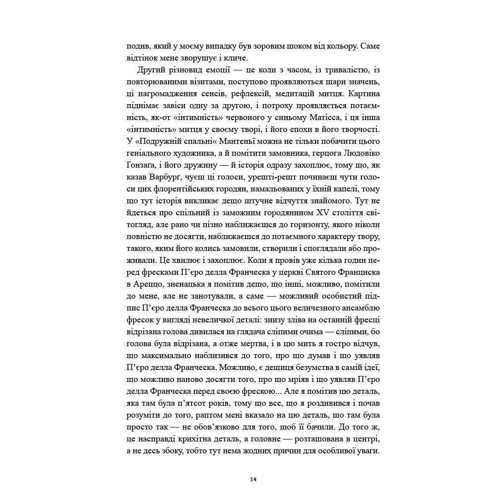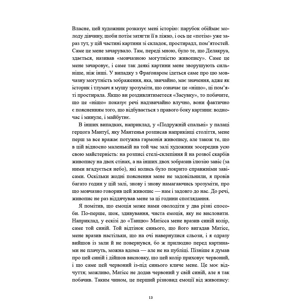 Книжку укладено на основі циклу з двадцяти п’яти передач, трансльованих по радіо France Culture під назвою «Історії картин» влітку 2003 року. Даніель Арасс із притаманним йому ентузіазмом, сміливістю й ерудицією проводить нас через шість століть історії живопису — від винайдення перспективи до зникнення фігури. Звертаючись до основоположних питань (перспектива, сюжет Благовіщення, роль деталі, піднесення й занепад анахронізму, реставрація й умови огляду витворів на виставках) він інтелектуально і пристрасно оживлює ключові постаті й стилі: Леонардо да Вінчі, Мікеланджело, маньєризм, Вермеєр, Інґрес і Мане. Його аналіз постійно підживлюється конкретними прикладами, кульмінацією яких стають дуже специфічні аспекти сучасного мистецтва. Саме так, через тонкі й відкриті прочитання, які він пропонує, Даніель Арасс прищеплює смак до бачення й переосмислення великих моментів живопису — дивуючи, пробуджуючи й залучаючи нас до справжньої магії свого інтелекту, незмінно приправленого гумором.