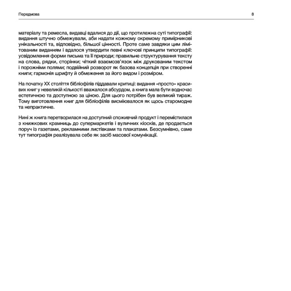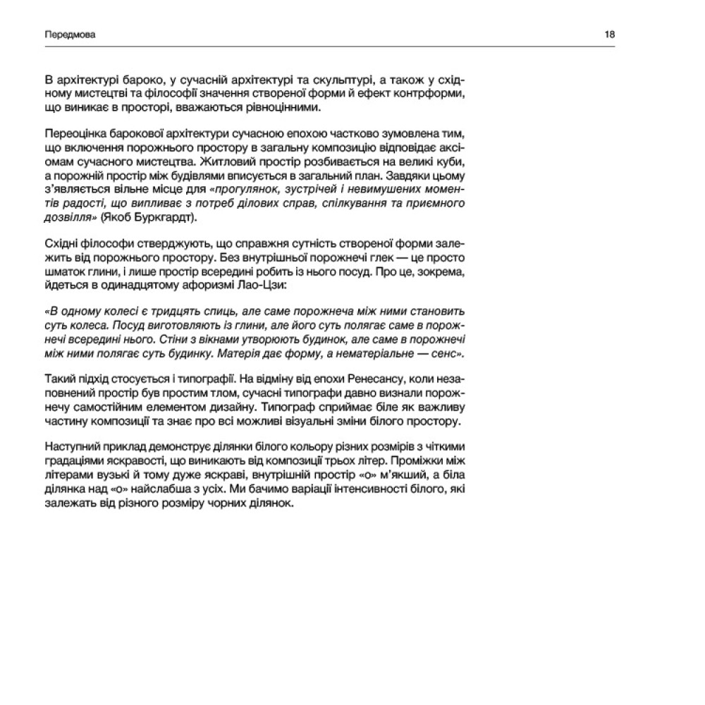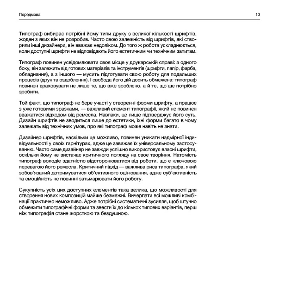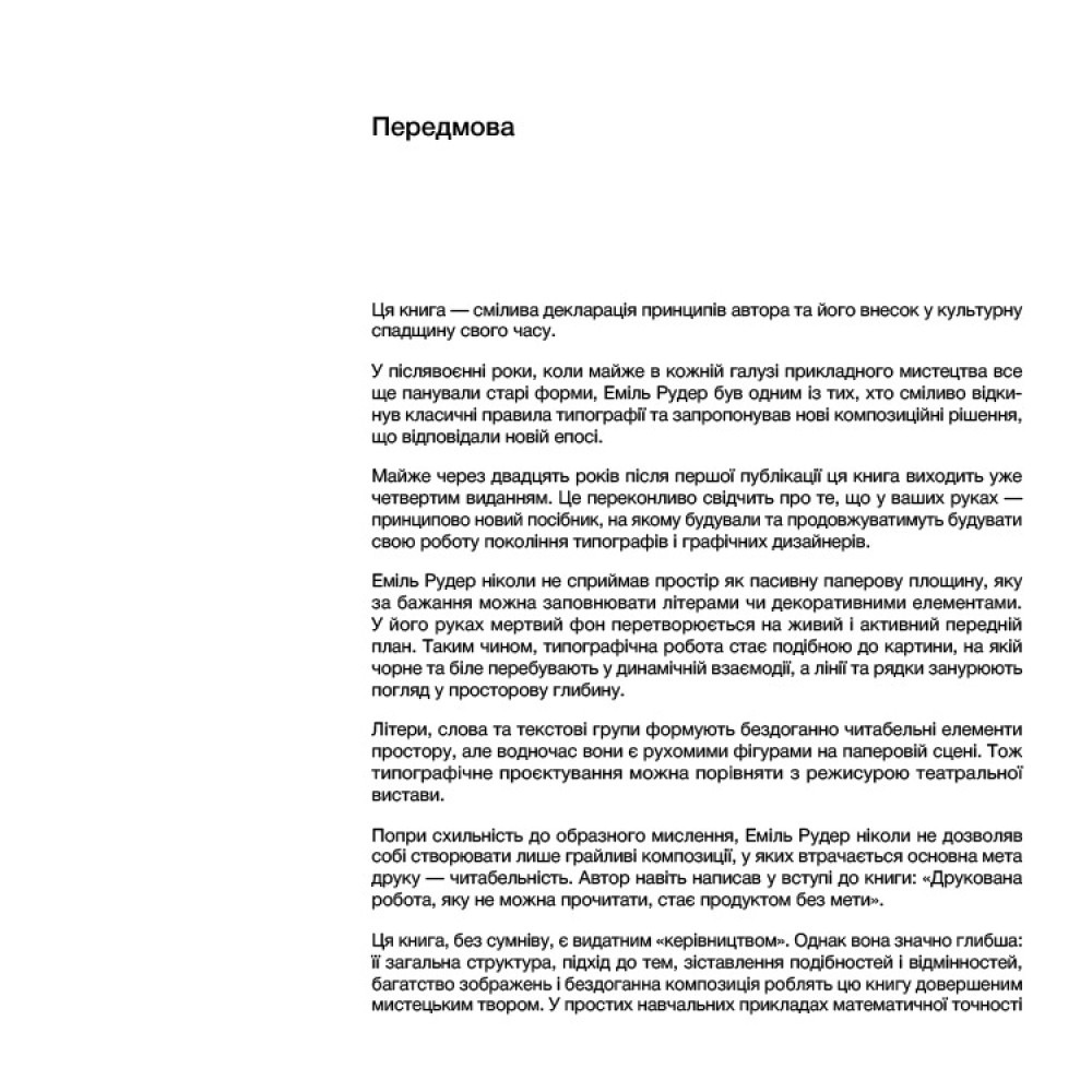 Ця книга є спадщиною Еміля Рудера, одного із засновників швейцарського стилю в дизайні, відомого в усьому світі за використання асиметричної верстки, модульної сітки, шрифтів без засічок, вирівнювання по лівому краю та порожнього простору на сторінці. Його методологічний підхід до типографії визнаний графічними дизайнерами в усьому світі. Видання містить чітко структуровані теми, ілюстрації та гармонійно дібрані шрифти, а також міркування автора про принципи дизайну загалом. Сьогодні, через більш ніж п'ятдесят років після першої публікації цієї книги, чимало її тез досі є актуальними та засадничими, водночас з деякими ви можете подискутувати, враховуючи нові тенденції у світовому дизайні.