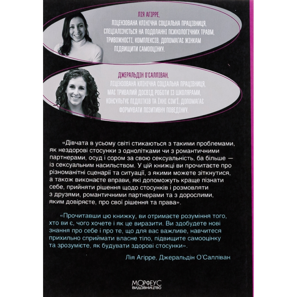 Досвідчені соціальні працівниці Лія Агірре та Джеральдін О’Салліван (США) в доступній формі, з дотриманням конфіденційності аналізують реальні випадки та пропонують засоби, які допоможуть дівчатам упевнено проходити цей непростий період.